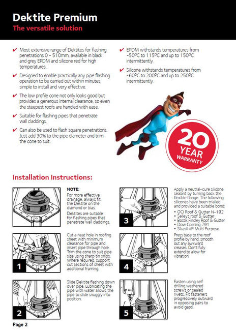 Dektite® resist ozone and UV light damage, and retains full flexibility under temperatures from -50 degrees C to 115 degrees C, and up to 150c degrees C intermittently.